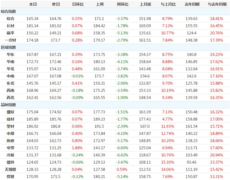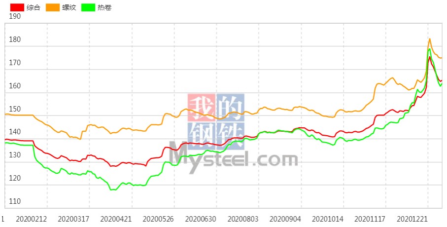 12月31日,國內(nèi)鋼材指數(shù)(Myspic)綜合指數(shù)報(bào)165.34(絕對(duì)價(jià)格指數(shù)4709),較上一交易日上漲0.35%。其中,螺紋鋼指數(shù)報(bào)175.64(絕對(duì)價(jià)格指數(shù)4424),較上一交易日上漲0.07%。熱卷指數(shù)報(bào)164.03(絕對(duì)價(jià)格指數(shù)4599),較上一交易日上漲0.80%。